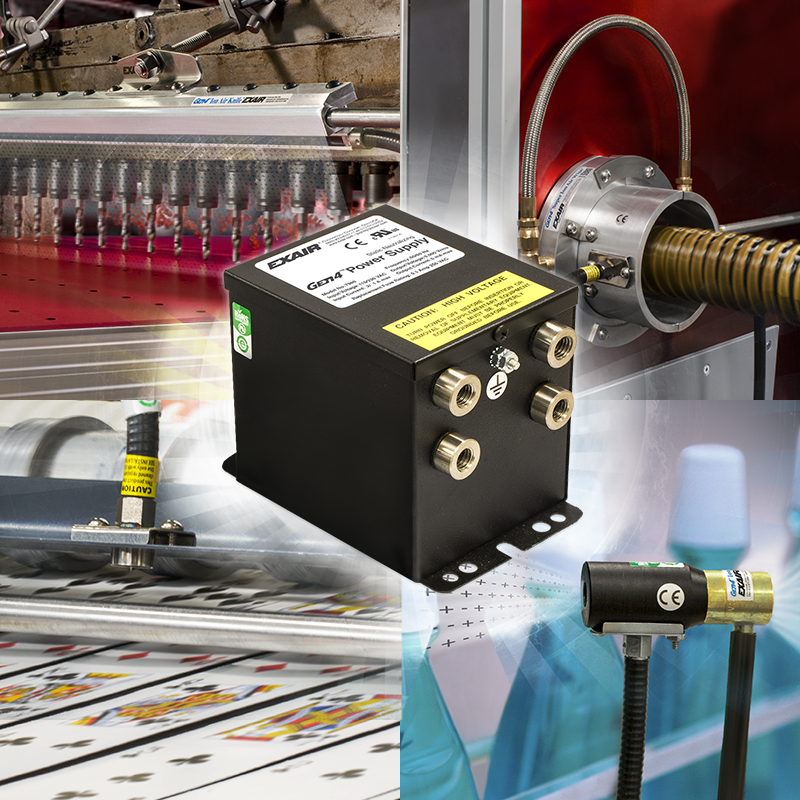 EXAIR's new Gen4 Four Outlet Selectable Voltage Power Supply allows you to choose input voltages of 115VAC or 230VAC. Four 5kV stainless steel output connectors can energize four static eliminators at the same time. Applications using up to four Gen4 Super Ion Air Knives, Ion Air Guns, Ion Air Cannons, Ionizing Bars or any other EXAIR Gen4 static eliminator product can be connected to one power supply. Like all EXAIR Gen4 products, these four outlet power supplies are UL component recognized, CE and RoHS compliant.