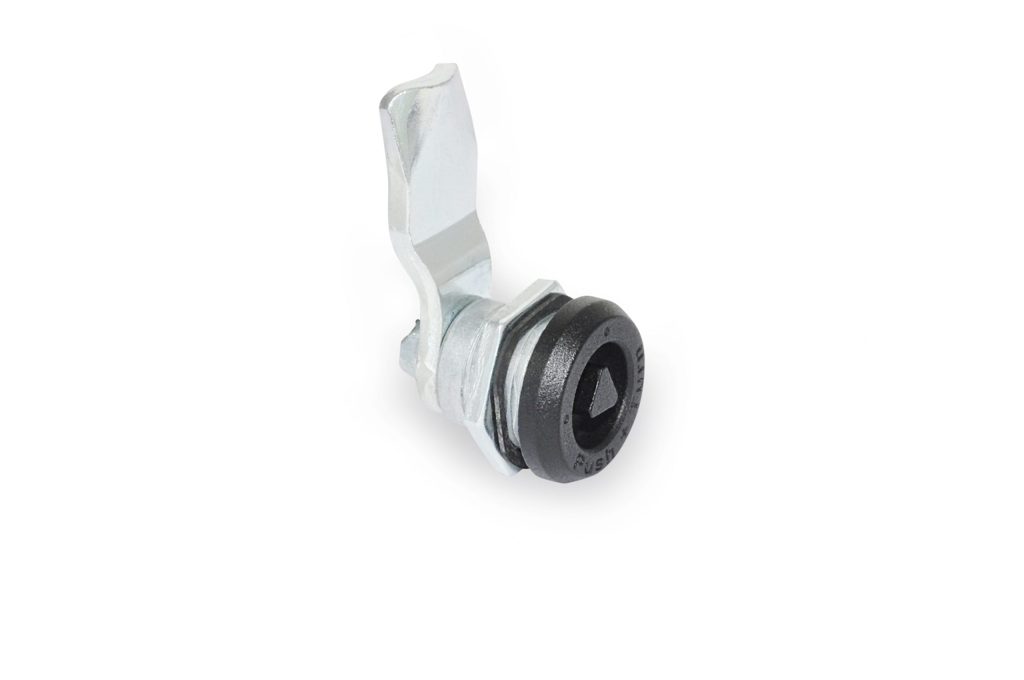 These latches, which are RoHS compliant, have a push-to-turn safety function. In the two end positions, the lock secures the spindle in place. The device can be turned 90° only when the operating element is pressed down, which releases the safety pin from the locked position. This feature protects the lock reliably from moving on its own or as the result of vibrations.