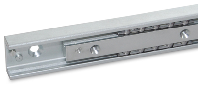 These RoHS-compliant telescopic linear slides are used, for example, for storage drawers and sliding doors or in jig making for a sliding motion in a linear direction. If the support screw is removed on both sides, the sliding distance extends the length of the rail plus an additional distance of slightly more than half the length of the rail. External elements should limit the maximum sliding distance; the supports of the rail have been designed to guard against the inadvertent extraction of the runner from the rail.