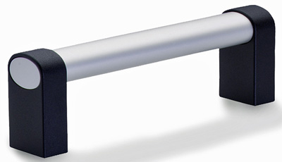 Handle legs are zinc die-cast, with a black powder coated finish, or silver powder-coated finish. The tube and legs are secured together with self-tapping screws. Screw heads are covered with light gray plastic cover caps to provide a clean and finished look. Special custom handle lengths are available upon request.