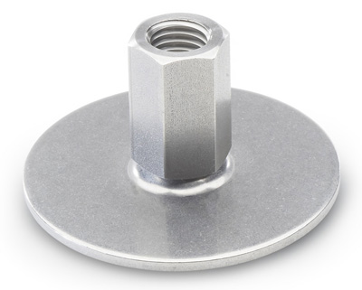Leveling feet have a tapped socket of stainless steel, European standard No. 1.4301 (American Standard Series 304), shot-blast finish. The assembly screw is of stainless steel A2, loctited in place. The optional plastic base cap is made of a black thermoplastic elastomer (TPE) with 80 Shore A hardness. The optional vulcanized non-skid pad is black Nitrile Butadiene rubber, with 70 (+/-) 5 Shore A hardness.