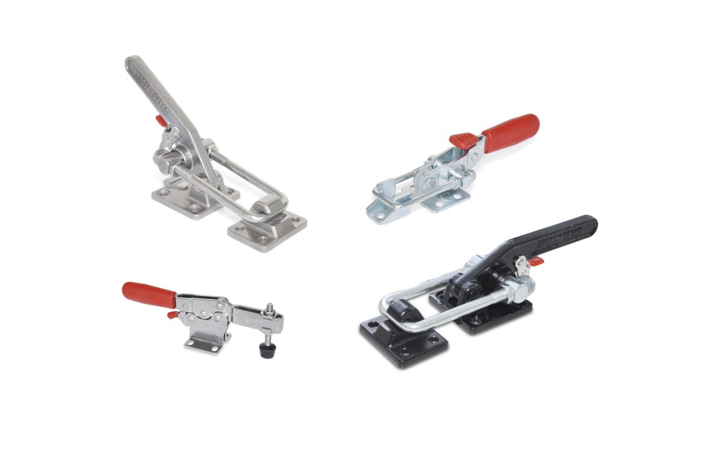 The GN 851.3 horizontal latch-type toggle clamps, with horizontal mounting base, clamping arm and safety hook, and the GN 852.3 steel and stainless steel latch-yype toggle clamps, heavy-duty type, with safety hook, are RoHS compliant. The clamps are compact in design and can be used to ensure high holding capacities. The circular movement of the handle is transformed into linear action of the latch. In the clamped position, the U-bolt latch with clamping arm is parallel to the plane of the operating handle. When clamped, a safety hook positively locks onto the body, which prevents inadvertent or vibration-induced release from the clamping position. Unlocking of the safety hook is achieved by one-hand operation. The stroke of the U-bolt latch of these toggle clamps can also be adjusted within its range.