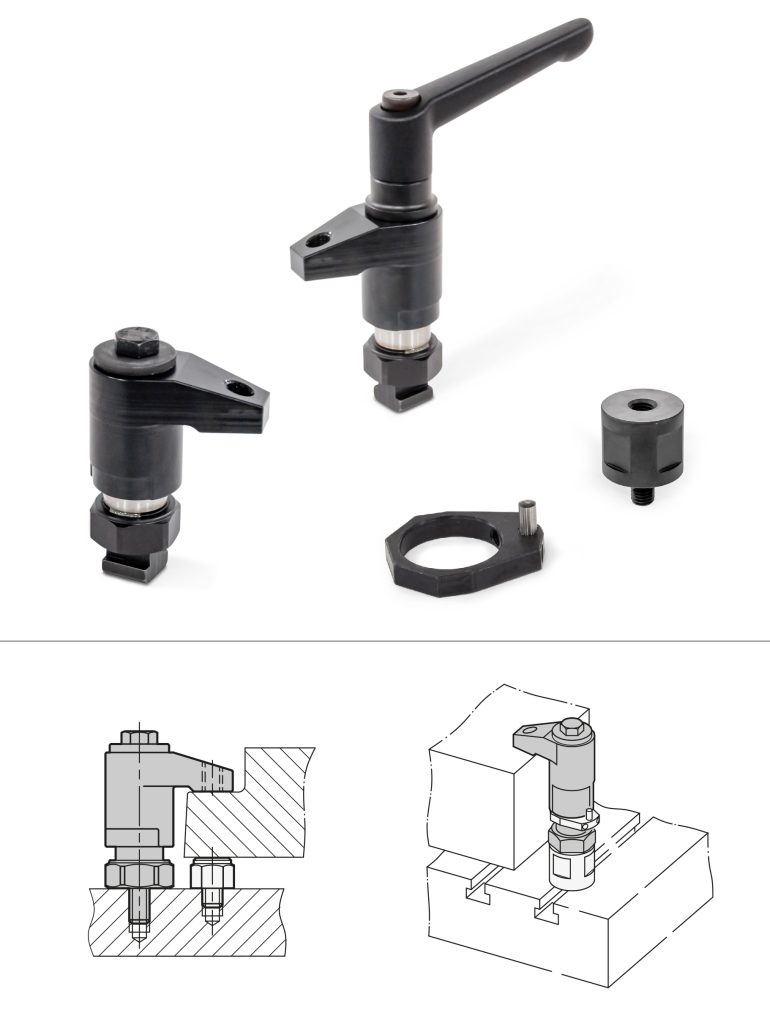 The new down-thrust clamp GN 9192 made from case-hardened steel can be fastened to a machine table with T-slots or to a fixture plate. The clamping arm can then be swiveled by hand and positioned over the inserted workpiece in any position. Turning and tightening the clamping screw or the adjustable hand lever lowers the clamping arm to hold the workpiece in place. After release, workpieces can be removed again from above just as quickly and easily once the clamping arm has been swiveled to the side – even when space is tight.