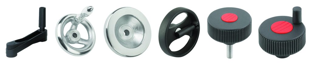 The hand wheels come equipped with fixed handles, revolving handles or no handles. Handwheels are made of a variety of materials such as cast iron, aluminum, Duroplast plastic, stainless steel and finished including chrome plated and powder baked. Cranks are available in a straight or offset style. They are available in cast iron and high-density thermoplastic, in either a revolving or folding handle style.