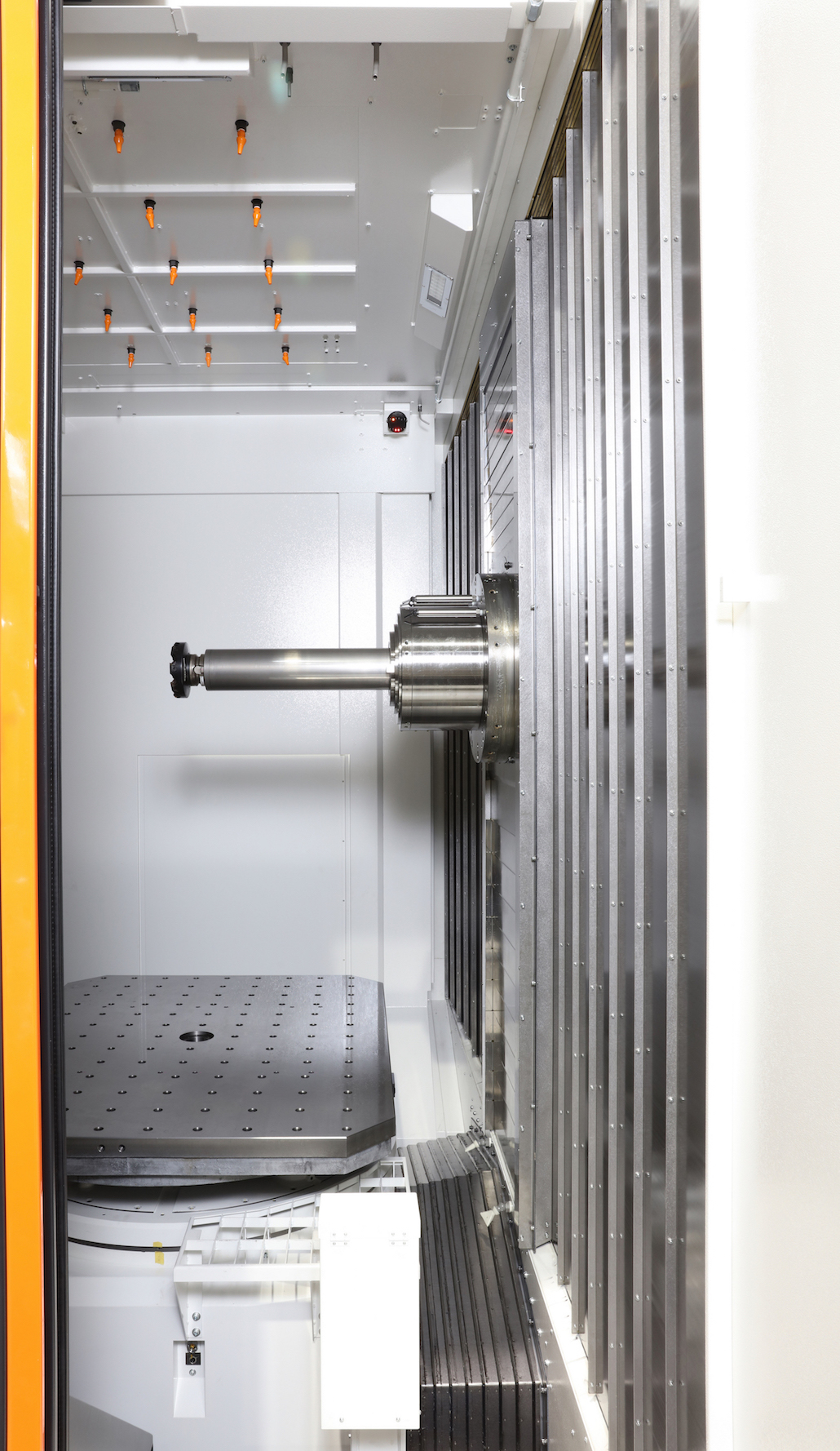 The Mazak quill features a built-in motor, high-torque, direct-drive, 50-hp (37-kW) spindle that puts out 1,000 ft.-lbs. (1,357 Nm) of torque. Mazak equips the quill with linear drive guides, as well as both angular contact and roller-type bearings. Roller bearings in the front of the spindle provide stability against strong side forces from face milling or heavy roughing, while the angular contact bearings in the back support the quill's Z-axis thrust for heavy duty boring and drilling operations.