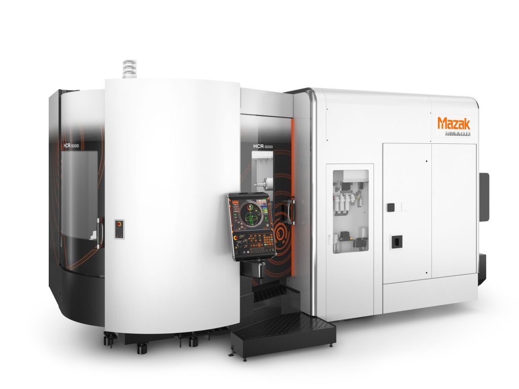 Mazak Corp.'s HCR-5000 horizontal toolchanger. See automatic toolchanger." title="CNC machine tool capable of drilling, reaming, tapping, milling and boring. Normally comes with an automatic toolchanger. See automatic toolchanger." aria-label="Glossary: machining center">machining center is a 5-axis machine that provides efficient, high-speed machining of small and mid-sized aluminum components and allows for several automation options for increased output. Designed to provide the aerospace and semiconductor/high-tech industries and others with numerous technological innovations, the HCR-5000 offers, in addition to 5-axis machining, a range of high-speed spindle options, from a standard 12,000-rpm spindle up to a 30,000-rpm version, each of which feature an integral spindle/motor and core cooling that minimize thermal growth for higher accuracy. The machine's auto toolchanger (ATC) features a standard 40-tool magazine with options for 80, 120 or 160 tools available to fit individual shops' needs.