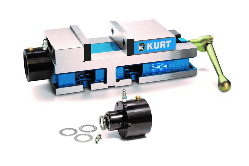 Kurt's new KHU6 hydraulic unit comes ready with both single- and double-acting capabilities providing a convenient option to the users preferred clamping method. Single-acting method uses hydraulic clamping and spring return for unclamping. Double-acting capability uses both hydraulics to clamp and unclamp for faster, more precise setup.