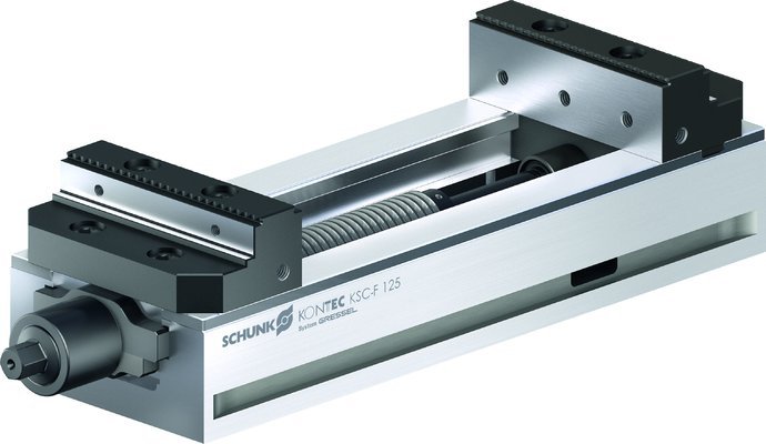 The SCHUNK KONTEC KSC-F single-acting clamping vises with fixed jaw, achieves high clamping forces at comparably low torque. Due to the 160 degree "Quick Clamp" force intensifier, workpieces are clamped in less than a second, and the vise is safely locked, making retightening with a torque wrench no longer necessary. The vise can be easily actuated by a standard hexagon connection using either conventional socket wrenches, extensions, or torque wrenches.