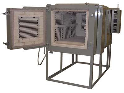 Constructed with an angle iron steel frame and heavy gauge sheet steel facing welded to form a rigid unit, this furnace heats to 2000°F. With a three zone master/slave temperature control system and overtemperature safety controls linked to a computer interface, reduced cooling time is achieved through a fresh air damper system. 54 kW power is generated through heavy gauge wire heating elements in removable radiant panels located in the door as well as side walls and rear wall of the furnace.