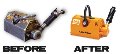 Every magnet repaired by Eriez is returned with a "Certificate of Compliance," guaranteeing the repairs and load tests of the magnet comply with ASME B30.20. Plus, Eriez repairs come with a one year "as new" warranty. If a magnet passes Eriez' two-point inspection: 1.) load test within specifications and 2.) magnet rotor intact and operational, it may qualify for the company's Magnet Exchange Program. Through this program, SafeHold Lift Magnets are in stock and available to ship within 24 hours.
