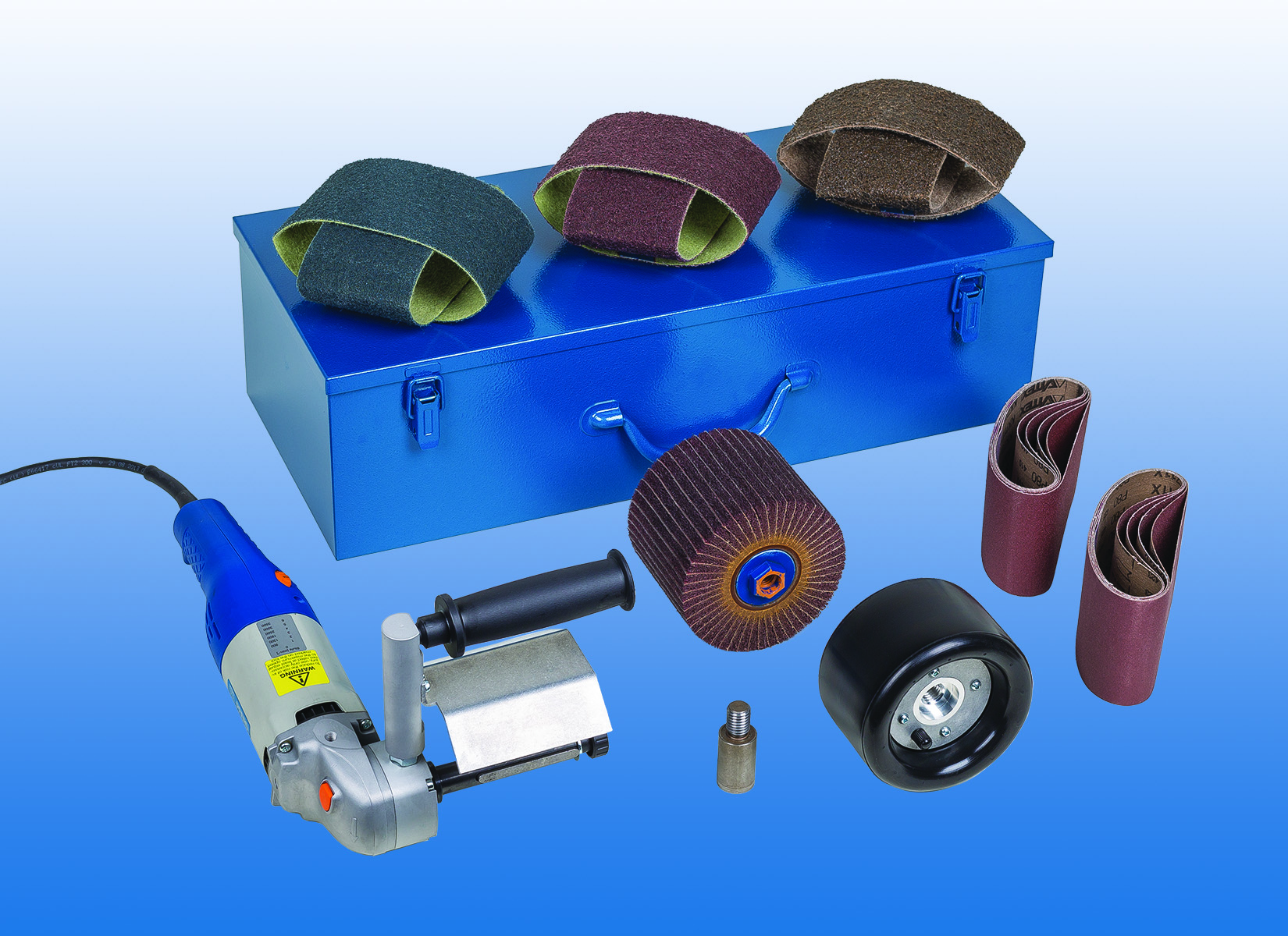 The set also features a selection of PFERD POLIVLIES non-woven surface conditioning belts, an aluminum-oxide coated abrasive belt, a pneumatic drum holder for belts and a new electric linear finishing tool. This 120V variable-speed tool features a step-less speed range of 850 to 3,800 rpm at a power output of 900 watts. A removable keyed drive spindle also allows for mounting of wheels and drums with keyed arbor holes, as well as 5/8-11 threaded products.