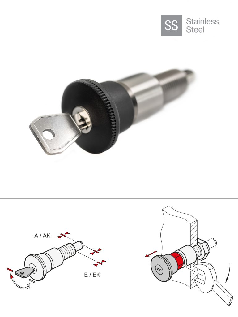 The stainless steel indexing plunger is available with two different lock versions: Lock type SC allows all indexing plungers in use to be operated with the same key, while lock type SU requires a different key for each indexing plunger.