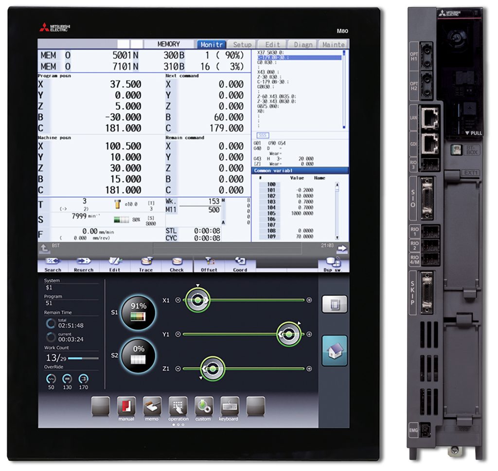 Mitsubishi Electric Automation introduces the M80W computer numerical controller, the latest in its M8 series CNCs. The M80W features a touch screen Windows-based display that is separate from the control unit, providing expandability and flexibility. Incorporating the latest operating system and slim personal computer, the M80W includes two expansion slots for 32GB SD cards, allowing OEMs and end users to add up to 64GB more memory for even greater flexibility.