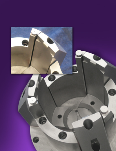 Special, tall top jaws are diamond-coated for a secure grip on the casting. An axial locator with button pads is used as a resting surface for the part's flange while swallowing the rest of the part.