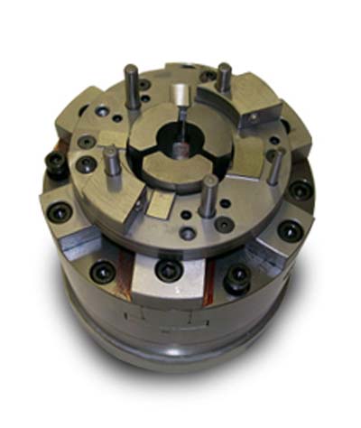 Northfield Precision Instrument Corp., a leader in the design and manufacture of precision workholding chucks, introduces their Model 450 Air Chuck. The Model 450 Air Chuck (with special top tooling) mounts on a Pallet which installs on the bed of the customer's machine. The machine's pick-and-place arm picks up the parts after they are finished in the front (2) chucks and transfers them to the rear (2) chucks for finishing. All hosing is routed under the plate for actuation of the chuck's jaws.