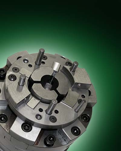 Northfield Precision Instrument Corp. explains how mounting a set of four Model 450 custom-designed air chucks on the customer's machine improves finishing efficiency. The four air chucks (with special top tooling) are mounted on a pallet that installs on the bed of the customer's machine. The machine's pick-and-place arm picks up the parts after they are finished in the front two chucks and transfers them to the rear two chucks for finishing. All hosing is routed under the plate for actuation of the chuck's jaws.