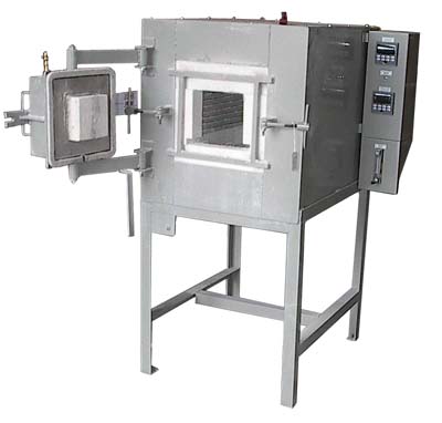 A silicon carbide heath plate supports the muffled work chamber while allowing thermal transfer from the floor heating elements. An insulated double pivot horizontal swing door, Honeywell digital programmable temperature controller, flow meter and over temperature safety system are all built in to this atmosphere muffle furnace.