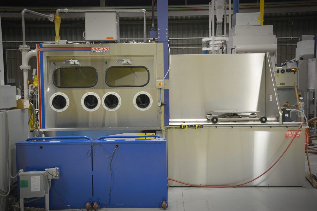 The WBS/Guyson Model 72x36 dual-operator system is for cleaning and surface preparation of low-volume, high-value aircraft engine components up to 55 inches in length and 24 inches in diameter. It is fabricated of 12-gauge 304 stainless steel material having a #4 polished finish.