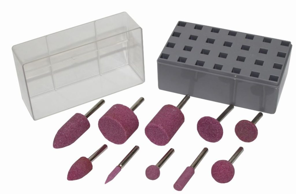 The stones have a distinct pink color due to their components and can be used on a variety of steels and alloys where sharp cutting action is essential. The characteristics of the pink abrasive grain make the stones exceptionally durable while providing cooler cutting. Each kit contains a wide variety of stone sizes for use on both large and small workpieces.