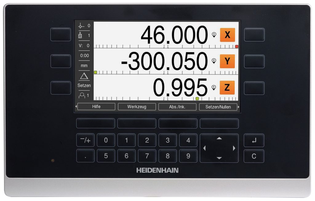Many new features are being introduced on the ND 5023 including the new dynamic zoom feature which offers a noticeable improvement in position value readability. Once activated, the display value for the axis currently being moved is magnified. For small numbers (i.e., numbers close to zero), the character height can be increased from 17 mm (standard height) to 25 mm. The operator immediately sees which axis is currently moving and can also easily read the numerical value from a greater distance. When the axis stops moving, the display returns to its standard size. The display is also easily configured for right-handed or left-handed operation.