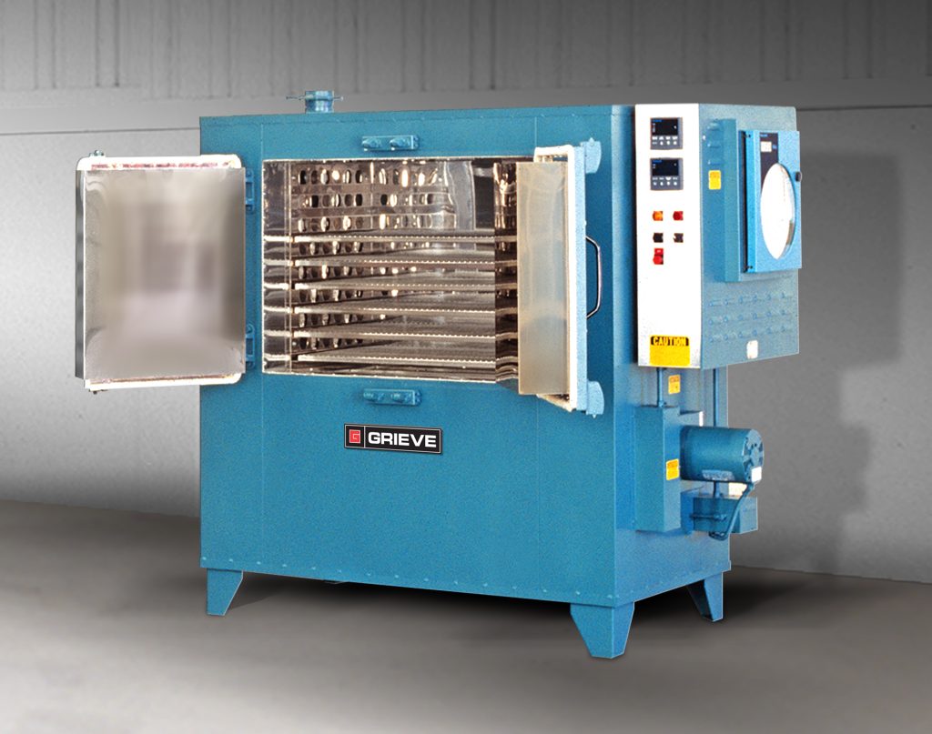No. 934 is an 850° F (454° C), cabinet oven from Grieve, currently used for heat treating at a customer's facility. Workspace dimensions of this oven measure 38" W x 20" D x 26" H, and 10 KW are installed in Incoloy sheathed tubular heating elements, while a 600-cfm, 1/2-hp recirculating blower provides horizontal airflow to the workload.