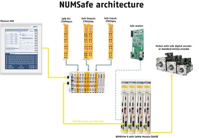 NUM has released a sophisticated system-wide functional safety architecture for its CNC system, providing an exceptionally scalable solution that can be applied very easily to almost any type of machine tool — regardless of complexity or number of axes. Known as NUMSafe, it includes a dedicated safety PLC, safe input and output modules, and digital servo drives with built-in safe motion monitoring. It is compatible with NUM's new-generation Flexium+ CNC platform.