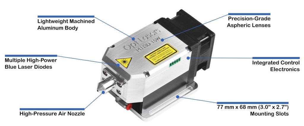 - Powered by Blue Laser Diodes - Unlike infrared light, blue light is more easily absorbed by numerous industrial materials. This directly translates to several advantages including reduced power consumption and more compact heat sinking.