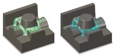 The toolpath supports cutters capable of machining very large depths of cut. It uses an aggressive, fast, intelligent roughing algorithm based on Mastercam's 2D high speed dynamic milling motion. A single toolpath can cut material in two directions: on step downs (-Z) and step ups (+Z). This highly efficient bi-directional cutting strategy removes the maximum amount of material with the minimum of step downs, significantly reducing cycle times.