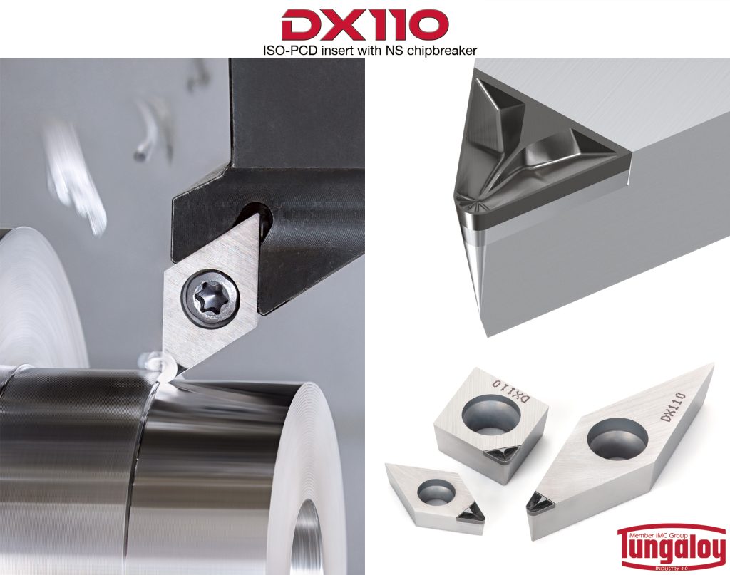 Total of ten new PCD inserts with NS chipbreaker are introduced in DX110 grade that provides the insert with secure edge line for high quality mirror-like surface finish.