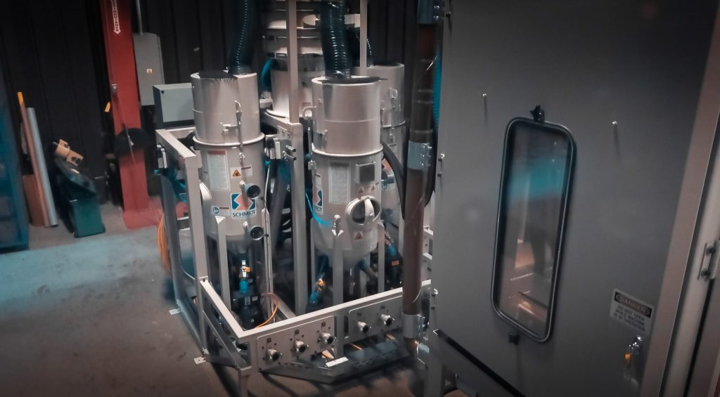 The customer opted for Guyson's standard dual media arrangement consisting of three 3.5-cu.-ft. pressure vessels, precision 75/12 cyclone and programmable quick-connect media hoses. Nine Thompson grit value combinations precisely control the media delivery, which is monitored and displayed on the Panel view 700. This custom cell was completed in less than 20 weeks.