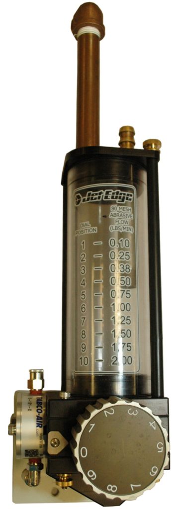 The Permalign V-Series Mini Hopper's water-resistant design helps prevent annoying abrasive clogs that can cause stoppages and scrap out expensive material. Built for the harsh abrasive jet environment, the Permalign V-Series Mini Hopper does not require an enclosure, allowing for much cleaner operation. The mini hopper is infinitely adjustable between 0.10 pounds per minute to 2 pounds per minute and features improved venting of excess abrasive.