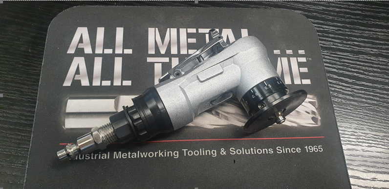 Specifications: Chamfering capacity of this tool is .1mm to 1.5mm, (.004" to .060"). Work depthpic is .1 to .9mm, (.004" to .035"). The tool runs on air consumption of 7.7 CFM and 90 PSI. The air inlet is ¼". It has a no load speed of 30,000 RPM. The wheel diameter is 1.73". The tool is 5.7" long, and only 1.5 lbs. which makes it light and easy to hold and work with.