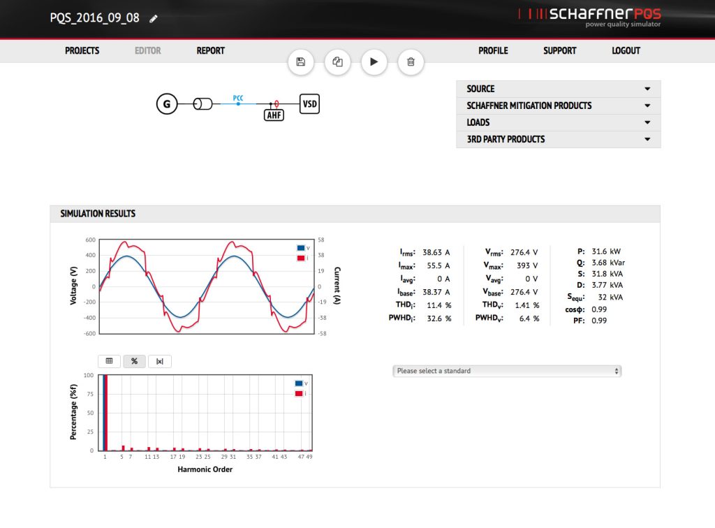 If the system design will not support the load, for example, a message will be generated suggesting that a larger transformer may be required and then stay illuminated until the power supply issue is rectified. PQS supports all Schaffner harmonic mitigation technologies, including active and passive harmonic filtering, and chokes, as well as power factor correction.