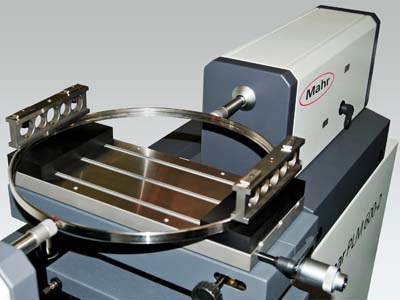 Now Mahr provides the capability to measure such parts in their undeformed state as a standard feature on their Precimar PLM 600-2 high precision length measuring systems. This capability is especially important for measuring thin-walled work pieces, such as the rolling bearing ring pictured. If a technician checks the inner or outer diameter of a bearing on a length measuring machine during quality control, the bearing can be deformed even at low applied forces, thus distorting the measurement results.
