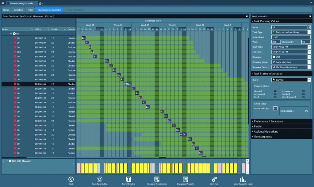 Once planners, project schedulers and those responsible for manufacturing create more detailed project plans, ProLeiS offers fast and convenient tools to organize and control capacity. All manufacturing steps for the individual parts are defined and scheduled using standardized planning templates. Once planning is complete, a supply of orders is provided for each resource—employee or machine—for processing in the specified sequence.
