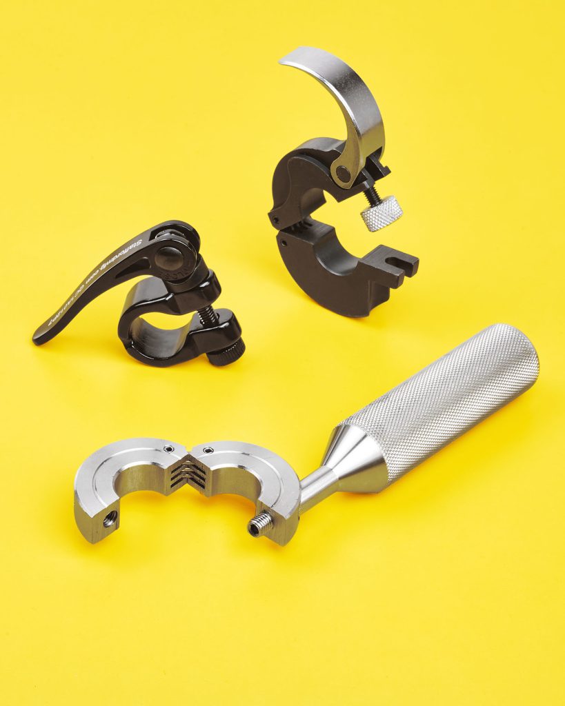 The third design alternative is the Grip & Go quick-release handle, which can convert any standard shaft collar into a rapidly adjustable locating device and comes in steel, stainless steel and aluminum in two sizes. The Staff-Lok is made from steel in 0.5" to 2.5" ID sizes, and the Flip-Lok is made from hard-coat black anodized aluminum with steel fasteners and comes in five ID sizes from 0.75" to 1.5".