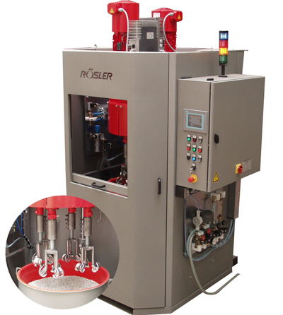 Rosler's new mini-drag machines provide 40x the grinding power of rotary vibrators yet eliminate impingement between delicate components. These machines include hydraulically powered carousel assemblies allowing vertical movement for versatile processing and are also equipped with up to four rotating work stations each with independent drives. Featuring heavy-duty construction, protective cabin with plexi-glass doors, and industrial grade motors, all R-SF machines include a work bowl lined with highly wear-resistant polyurethane for years of durable service.