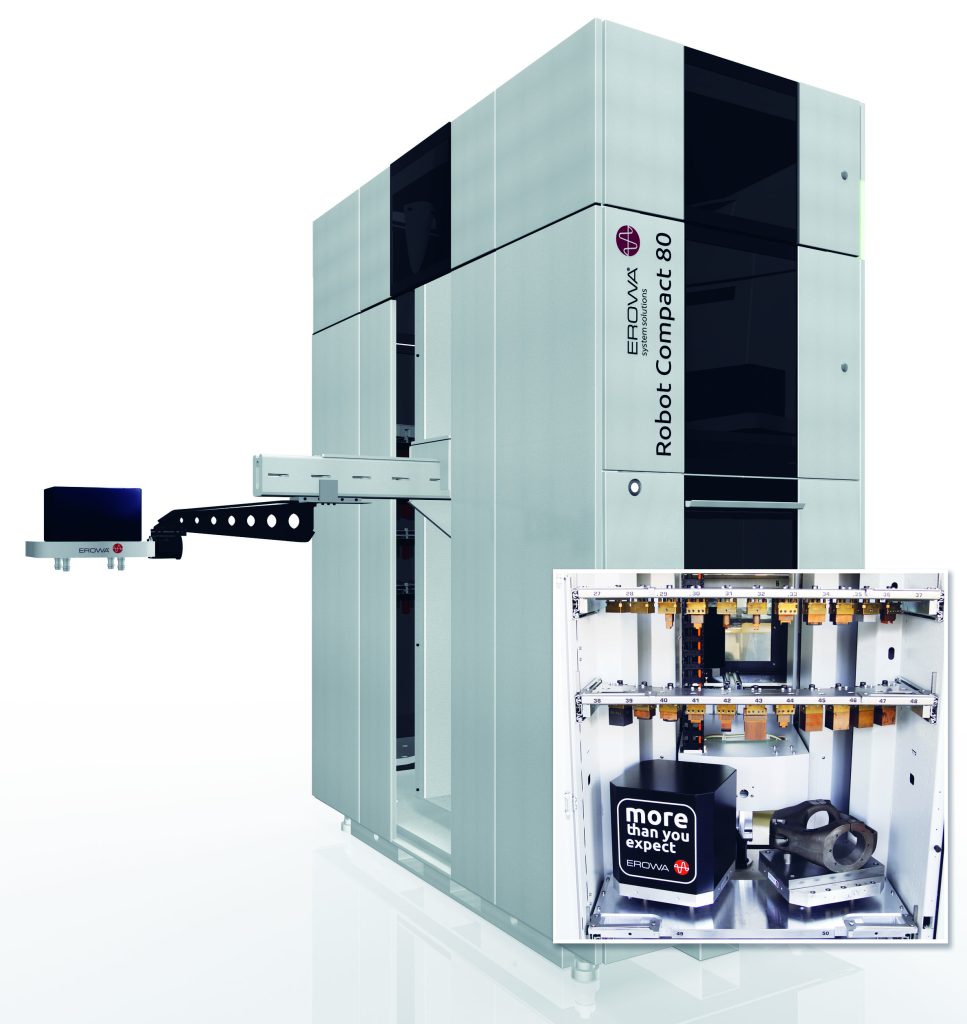 The EROWA Robot Compact 80 also has a fast swivel axis on the transfer arm, which ensures that cooling liquid or dielectric fluid stays within the machining area.