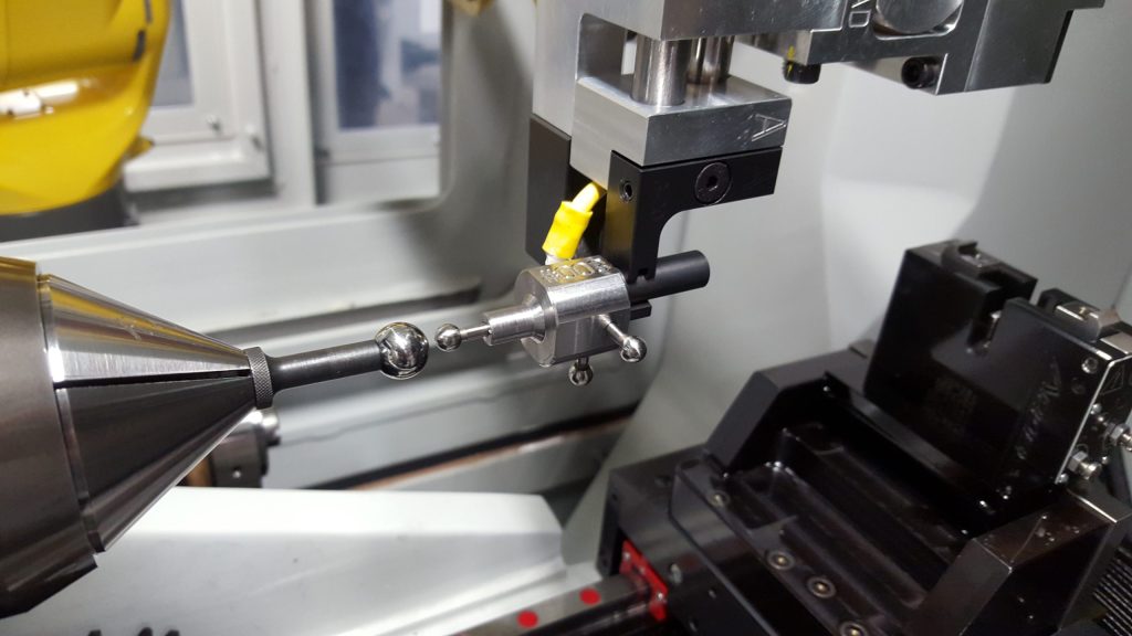 RoboTeach is a machine-run program that uses the high accuracy of the grinding machine to measure the robot position and automatically teach and calibrate robot positioning. The teaching process uses an electrical contact touch probe held in the robot gripper and a mandrel that locates the position of the machine collet adaptor and tool storage pallets.