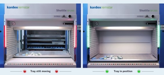 The Kardex Remstar Shuttle XP Vertical Lift Module (VLM) can now be equipped with Access Ready Light technology to improve picking productivity and accuracy. This new light tool now available helps operators visualize when the tray is in the access opening and ready for picking or putting. This upgrade, "Access Ready" lights, improves storage and retrieval of goods and order picking performance.