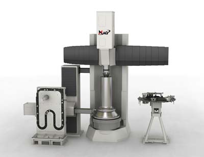 A new sidehead option on MAG vertical turning centers (VTCs) utilizes a 250-mm-square (10 inch) ram to deliver 34,000 N (7,600 pounds) thrust from the optimum angle for efficient turning of tall or flanged parts in vertical orientation. The sidehead option is available on machines with table size 1,250 to 3,500mm (49.2 — 137.7 inches), capable of handling parts up to 3,700mm (145.6 inches) maximum diameter and 3,300mm (129.9 inches) height. The sidehead provides a 1,250mm (49.2 inch) X-axis span and 1,900mm (74.8 inch) Z-axis, with a traverse rate of 20,000mm/min (787 ipm). It is equipped for automatic tool change with a 40-tool chain magazine, and available with modular Capto C8 or KM tool interface.
