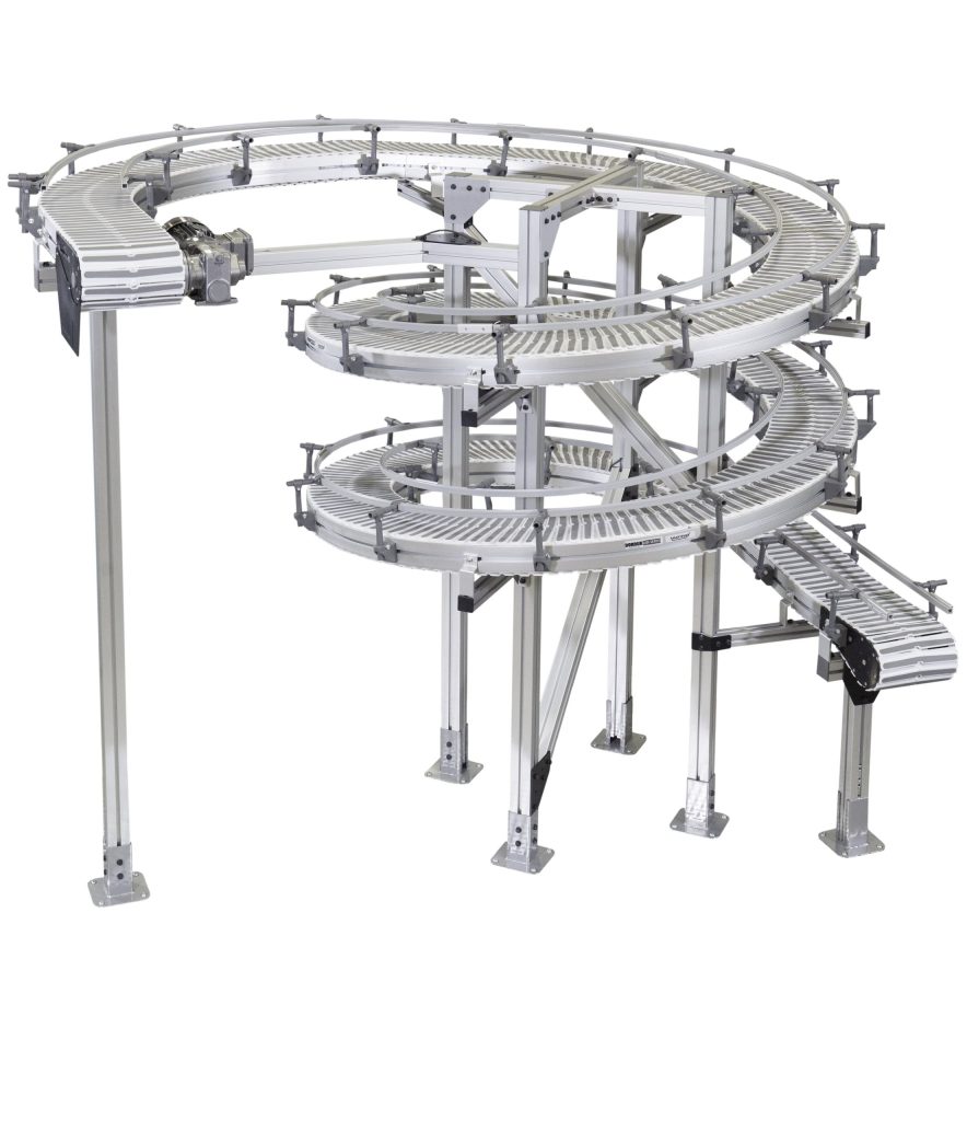 The tight turns and small footprint of the SmartFlex Helix Conveyors from Dorner provide facilities with greater flexibility in layout for applications such as accumulation, buffering, cooling product and more. The SmartFlex Helix Conveyors' infeed and outfeed can be positioned at any height or angle.