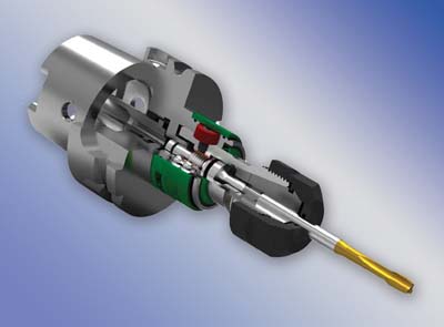 The modular system also employs a new Heli coil mechanism designed to reduce the force that occurs when tightening the collet nut. When tightening the collet nut with the tap fixed against the adjusting screw, there typically is movement which can damage the tap or adjusting screw. The axial movement of the collet can be (0.08 to 0.3), with forces of (800N to 5000N). The heli coil mechanism compensates for this axial movement, preventing unwanted displacement and potential damage to the tap or MQL adjusting screw. The new modular bodies are available in sizes KSN1 ER20 and KSN3 ER32.