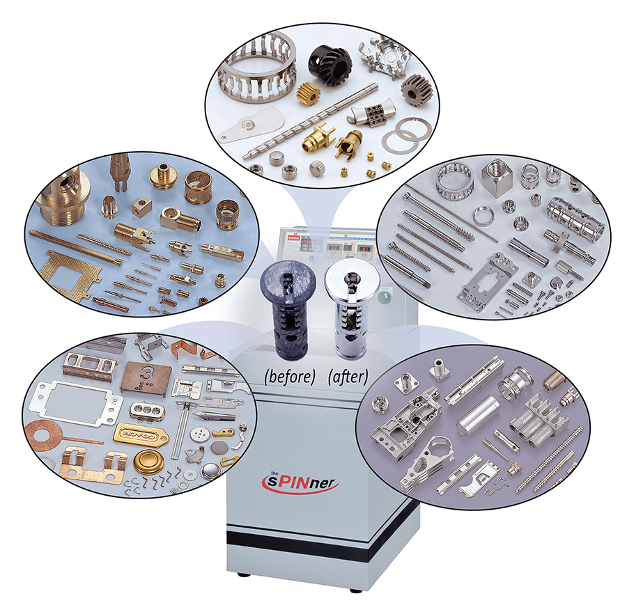 The sPINner machine from Techniks Industries quickly batch deburrs dozens of small parts. sPINner pin media deburrs where other media cannot reach and eliminates manual deburring, according to the company.