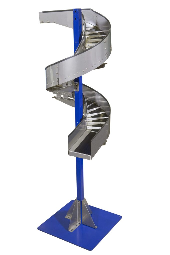 Spiral Chutes are suitable for lightweight products with a variety of package types, including cardboard, pouches, flexible packaging and corrugated boxes. The stair step design allows for different sized packages (lengths as short as 3"; weights between one ounce to 50 lbs.) to be lowered at the same time for added flexibility.
