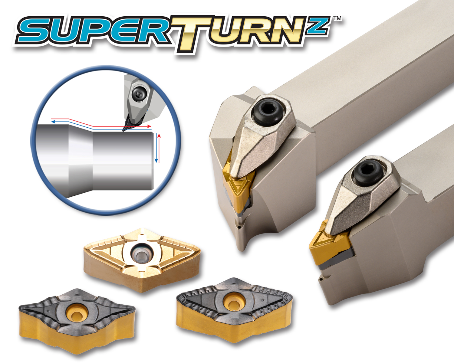 It represents a highly productive alternative to conventional turning where 80° & 35° corner inserts are fed in the same direction, and instead utilizes all 4 directions available on conventional 2 axis lathe (+Z, -Z, +X, -X) to maximize material removal. The double-sided positive SuperTurnZ inserts have the same axial & radial rake angle and capability as standard ISO positive inserts, allowing for low cutting forces, but with double the cutting edges and much higher feed rate capabilities.