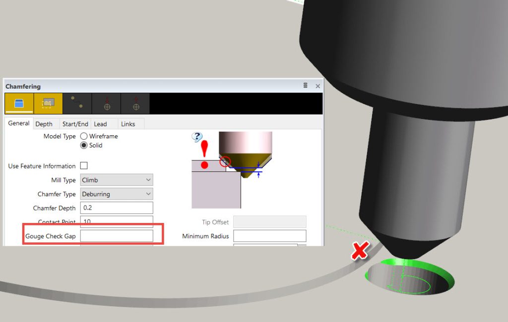 Gouge Check Gap has been added to the Chamfering Cycle to give even stricter control over the toolpath. Specifically, neighboring features which could potentially come into contact with the flute of the taper tool can now be excluded.