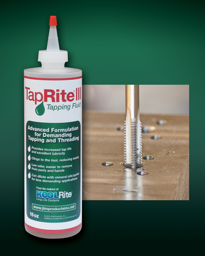 A new high performance tapping fluid has been announced by its manufacturer, JTM Products Inc. TapRite III Tapping Fluid features an advanced formulation for demanding tapping and threading applications in ferrous metals. It provides increased tap life and excellent lubricity in steel alloys and other severe uses as well as mild steels.