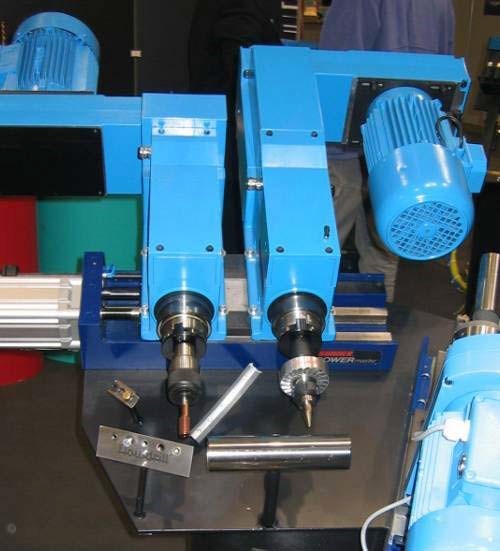 Suhner can offer for this work a range of drilling units with various feeding systems. The classical flow drilling units are the BEM 12 and the BEM 20, each with pneumohydraulic feed, i.e. a pneumatic feed regulated with a hydraulic cushioning cylinder. Pictured is a typical application where after flow drilling with the machining unit BEM 20, the thread is formed with the GEM 20 unit.