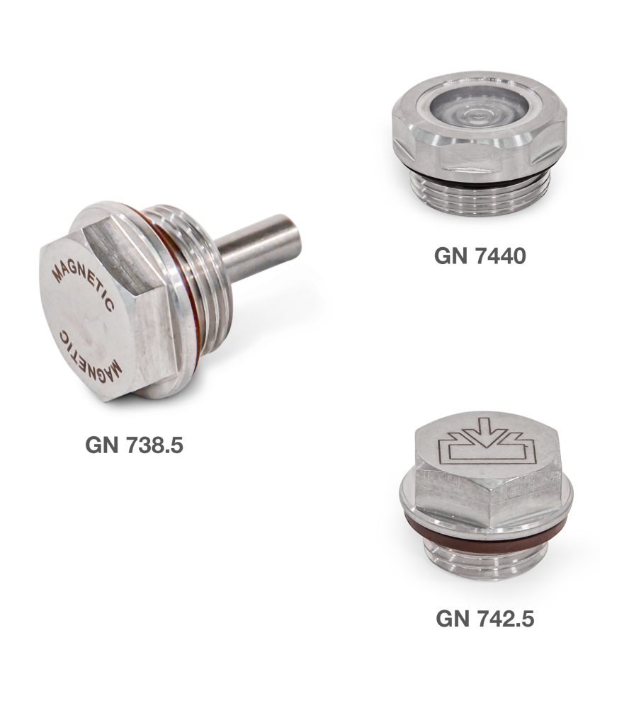 The magnetic plugs GN 738.5 look quite similar, except they have an integrated bar magnet that extends into the fluid to reliably capture any iron particles that could damage gears or the like.